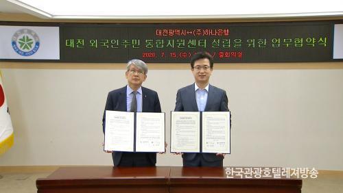 [Çѱ¹°ü±¤È£ÅÚ·¹Á®¹æ¼Û=Áö¿ì¿­ ±âÀÚ] ÇϳªÀºÇà À±¼ø±â ÃæÃ»¿µ¾÷±×·ì ÃѰý´ëÇ¥¿Í ÇãÅÂÁ¤ ´ëÀü½ÃÀåÀÌ ´ëÀü½Ãû ÁßȸÀǽǿ¡¼­ ´ëÀü¿Ü±¹ÀÎÁÖ¹ÎÅëÇÕÁö¿ø¼¾ÅÍ ¼³¸³À» À§ÇÑ »óÈ£Çù·Â ¾÷¹«Çù¾àÀ» ü°áÇß´Ù.